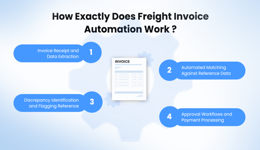 Automated freight invoice processing follows a defined sequence that moves documents from receipt to payment approval. Each step builds on the previous one, creating a complete validation path for every invoice.